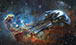 To give the effect of speed I selected and duplicated the rear, thrusters portion of the main ship and used the “Motion Blur” filter set at the same angle that the ship was traveling. I looked at NASA photos of re-entry burns and using a soft edged brush I painted in the appearance of heated vapors coming off the front of the foreground ship.  I also used a soft edged selection and added yellow and red to the front edge of the ship to make it appear to be glowing hot.