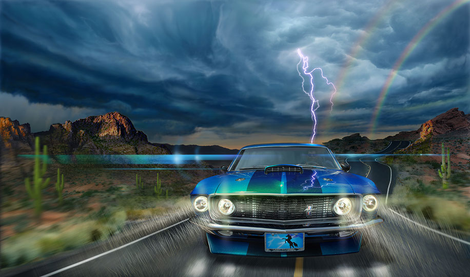 One day while photographing cars at our local Auto Show I spotted a classic 1965 Mustang. It was a crystal blue color and had a license plate showing a rearing horse with a blue bolt of lightning flashing behind it and silhouetting the horse. The image on the license plate gave me an idea of doing a painting of this car speeding down a desert highway at dusk with its lights gleaming and a flash of lightning in the distance.